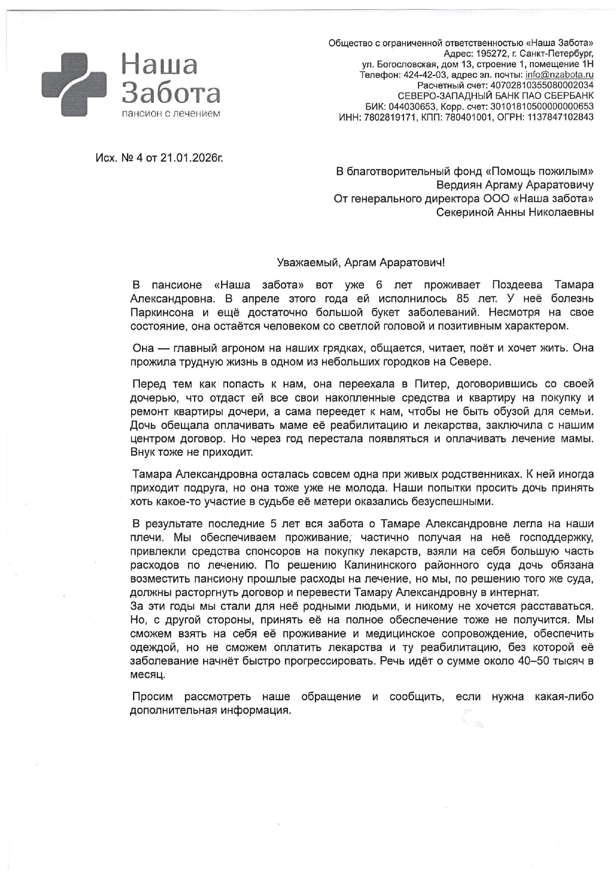 Из обращения директора пансионата "Наша Забота":