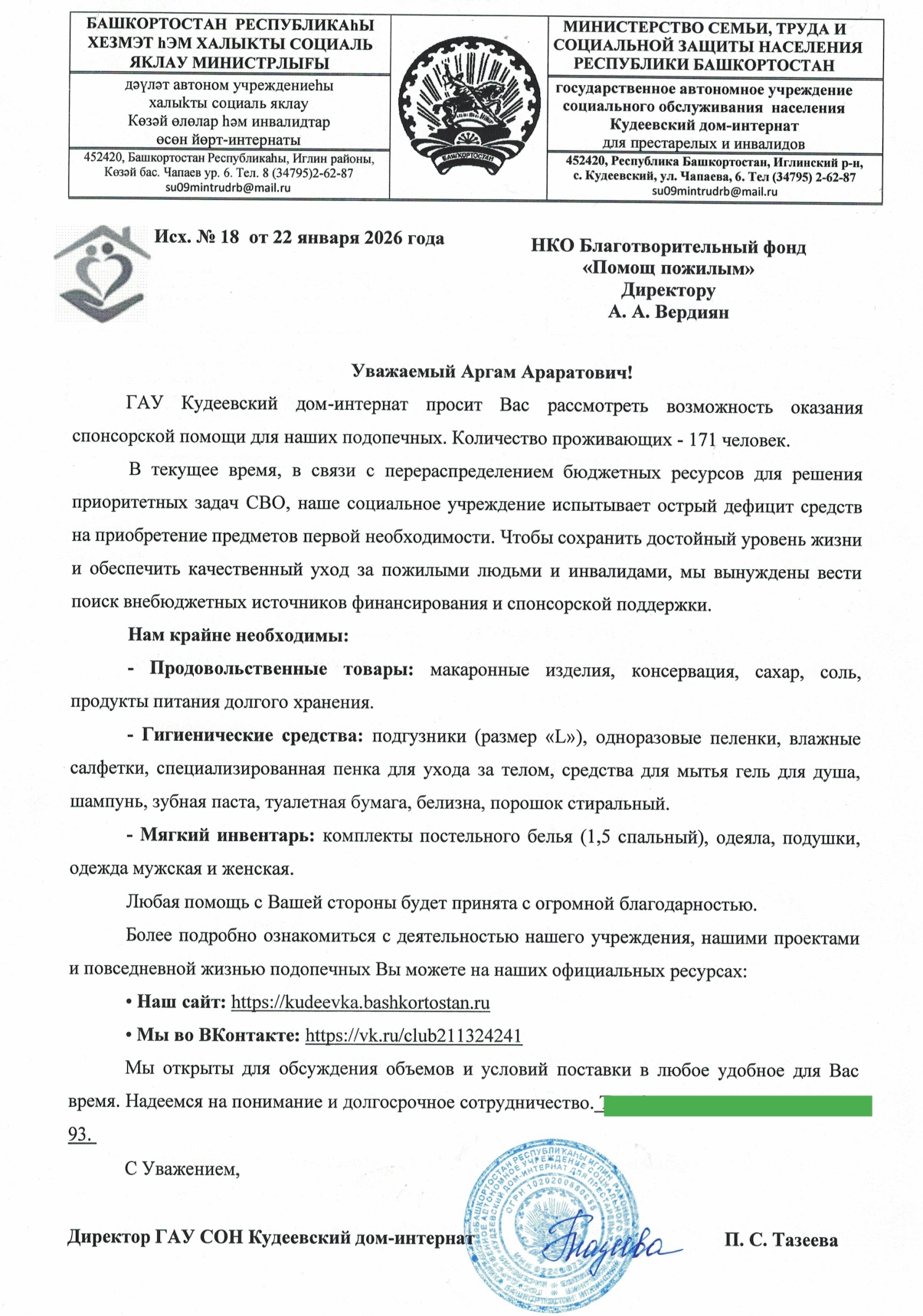 27 января 2026 года в Фонд поступило обращение от ГАУ "Кудеевского дома-интерната для престарелых и инвалидов" с просьбой оказать спонсорскую помощь.
